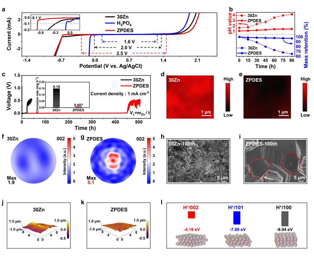 ZPDES显著拓宽了电化学稳定窗口,并展现出优异的抗腐蚀性能。该电解质能够有效抑制副产物生成,促进Zn(002)晶面的择优取向生长,从而提升锌负极的界面平整度与循环稳定性。理论计算结果进一步验证了质子调控在晶面取向形成中的关键作用 (图2)。