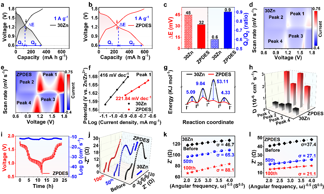 ZPDES体系表现出更低的极化电压和更高的比容量,体现出优异的氧化还原动力学。该体系有效降低了氧化还原能垒并加快了Zn2+的扩散速率,同时显著减小电荷转移电阻,展现出高效的离子传输与电极反应特性(图4)。
