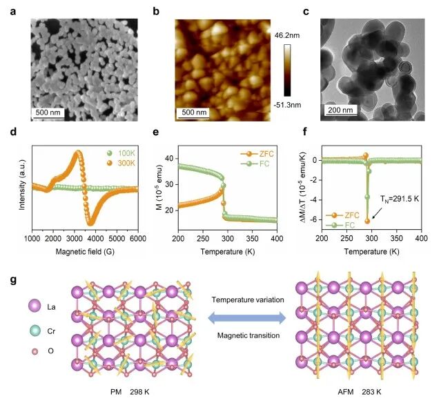 先进纤维材料全国重点实验室、功能材料研究中心张国军研究员团队联合中国科学院上海硅酸盐研究所王文中研究员团队,在挠曲电催化方向取得新进展。该成果以《通过调节LaCrO3的本征磁性增强挠曲电催化性能》(Enhancing Flexoelectric Catalytic Performance by Modulating the Intrinsic Magnetism of LaCrO3)为题,在线发表于国际期刊《先进功能材料》(Advanced Functional Materials 2025, e12272.)。论文第一作者为在读博士生潘映佟,共同通讯作者为张国军与王文中。研究提出“磁性调控助推挠曲电催化”的新策略,通过控制反应温度来调控LaCrO3的本征磁性,将其由顺磁(PM)调至反铁磁(AFM)有序,显著增强了挠曲电响应,并将过氧化氢(H2O2)产率提升了约 90%。机理研究表明,AFM 自旋有序削弱了表面对氧的吸附并限制电子转移,抑制过度活性中间体生成,使反应更倾向两电子氧还原(2e-ORR)路径,兼顾反应选择性与效率。该“磁性-挠曲电-化学”耦合思路为挠曲电催化制备H2O2提供了全新的调控途径。