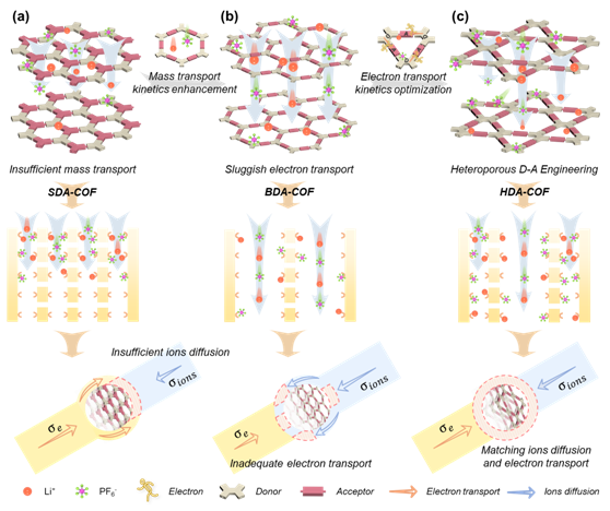 材料科学与工程学院、先进纤维材料全国重点实验室廖耀祖教授、吕伟副研究员课题组采用异孔工程策略,通过一锅希夫碱反应设计同步优化σe和σions的D-A型异孔共价有机框架 (HDA-COF)。基于D-A效应与异孔协同机制,利用三角形微孔作为电子桥提高电子电导率,并通过六边形介孔降低离子扩散能垒,实现了LIB的高倍率性能与高容量。博士生段举为论文的第一作者,通讯作者为廖耀祖和吕伟。相关成果以“高倍率锂离子电池用异孔供-受体共价有机框架正极(Heteroporous Donor-Acceptor Covalent Organic Framework Cathode for High-Rate-Capacity Lithium-lon Battery)为题作为Hot paper发表在《德国应化》(Angew.Chem.Int.Ed.)上。
