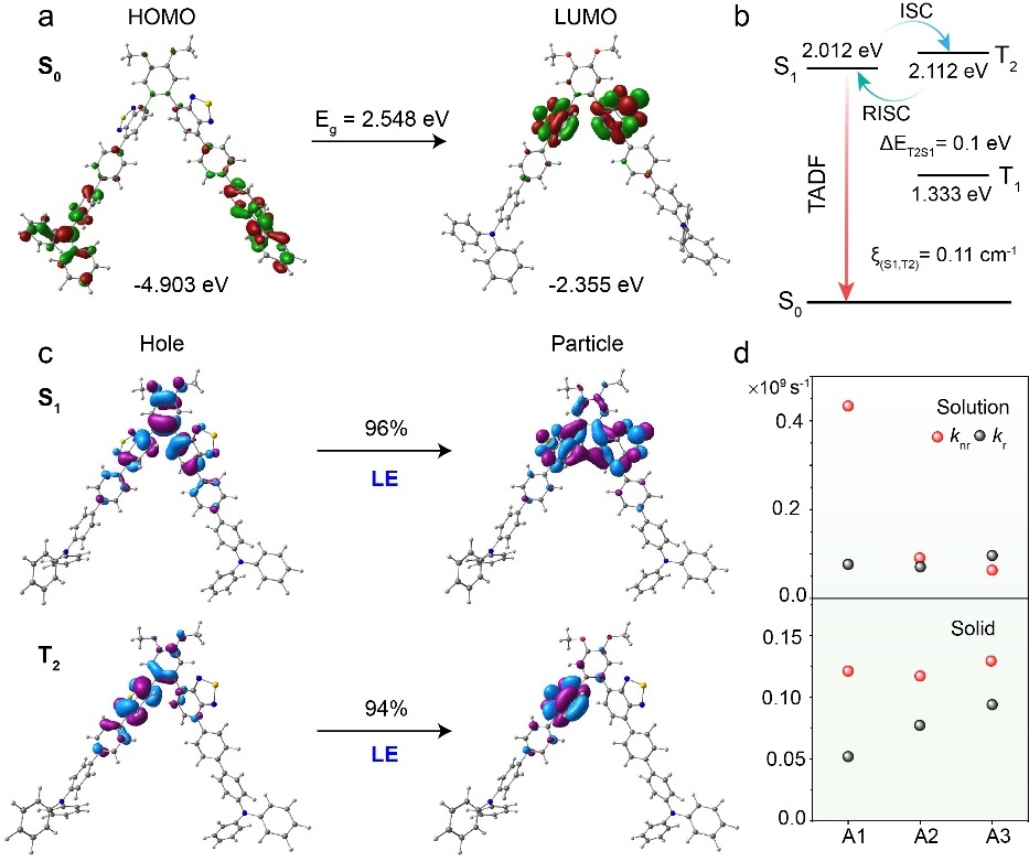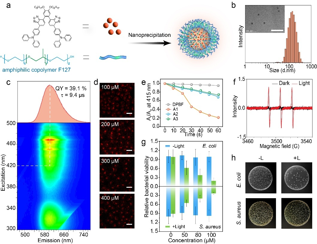 理论计算可知,合适自旋轨道耦合常数(SOC)以及较小的△EST(单三线态能带隙)保证了分子的TADF过程(图4)。该类多状态TADF发光材料还表现出优异的生物应用潜能。纳米粒子A2-NPs在细胞成像中展现出抗浓度的稳定成像性能。而纳米粒子A1-C-NPs在蓝光激发下可有效产生1O2,对金黄色葡萄球菌和大肠杆菌均表现出良好的杀菌效果(图5)。
