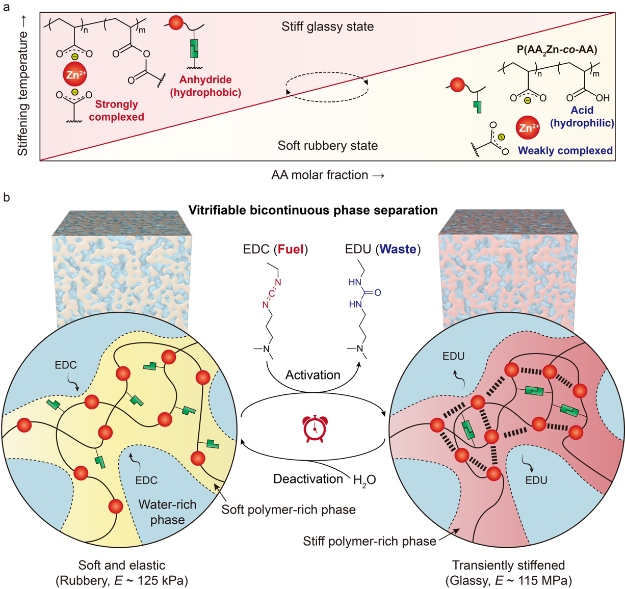 该团队近期研究发现,现有非平衡材料大都基于小分子组装或均一网络结构,其无法剧烈硬化的根本原因在于缺乏有效的玻璃化转变机制。他们提出,将非平衡化学与玻璃化相分离相结合,有望实现非平衡材料的剧烈可逆硬化。为此,他们合成了丙烯酸锌-丙烯酸(PAA2Zn-co-AA)共聚物水凝胶。其中,聚丙烯酸锌为典型LCST型热致硬化高分子,在硬化温度以上可发生橡胶态-玻璃态相分离转变。丙烯酸则扮演双重角色:一方面可在室温附近调控该水凝胶的硬化温度,另一方面可被化学燃料EDC催化脱水形成酸酐,而酸酐又随时间自发水解变回丙烯酸。这一EDC燃料驱动的非平衡转化可促使共聚物水凝胶硬化温度在室温附近切换,从而诱导材料瞬态硬化。在化学燃料刺激下,该水凝胶可从柔软的橡胶态(~125 kPa)可逆转变为坚硬的玻璃态(~115 MPa),模量提升高达920倍。这一模量不仅创下了人造非平衡硬化材料的模量纪录,也是首次将非平衡材料的硬化态推进到了玻璃态。此外,该水凝胶还展现出可编程的寿命和优异的循环性能。
