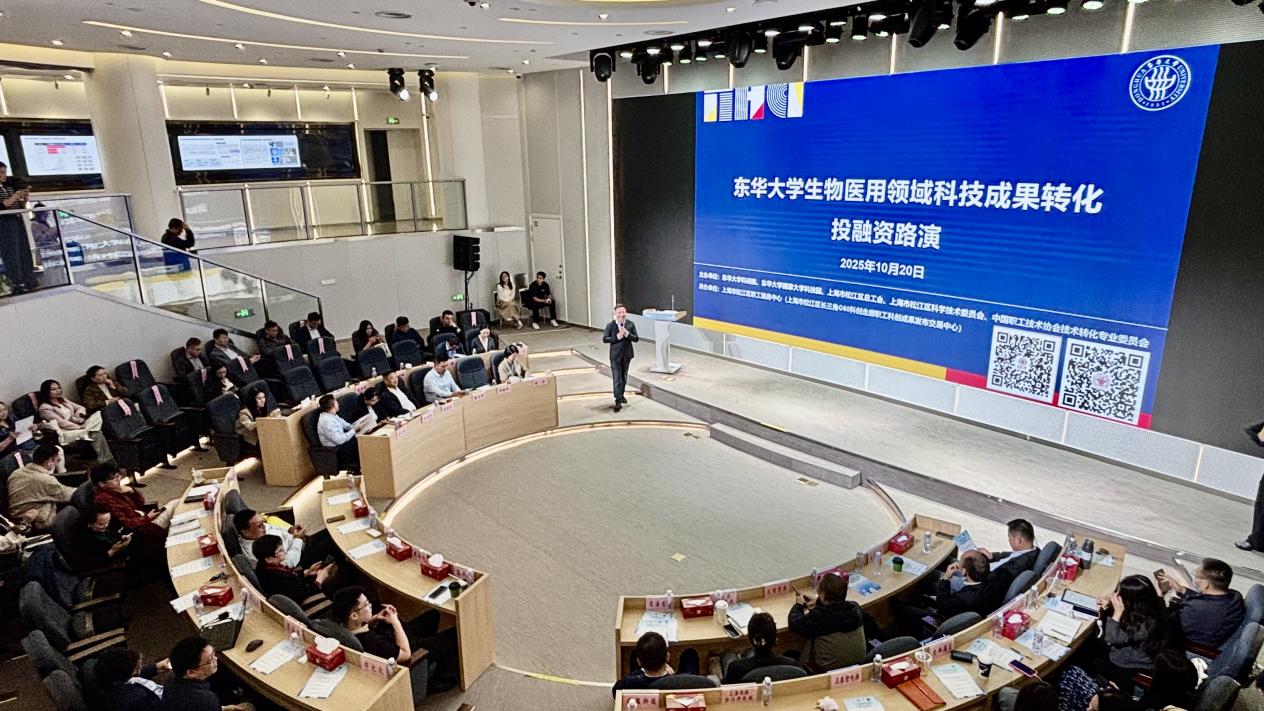10月20日下午,东华大学生物医用领域科技成果转化投融资路演活动在松江区工人文化宫C馆下沉式交易中心举行。本次活动由我校科学技术研究院、国家大学科技园联合松江区总工会、区科委、中国职工技术协会转化专业委员会联合举办。我校生物、纺织、材料等相关学院共11个项目团队代表与会路演交流,邀请生物医药相关企业、投资机构、技术转移机构等13家单位80余位负责人参会交流。