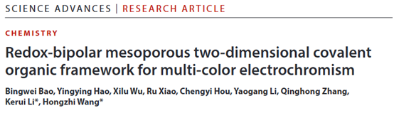 近期,东华大学材料科学与工程学院、先进纤维材料全国重点实验室王宏志教授、李克睿研究员团队设计并合成了一种双极性酰亚胺COF(图1),并创新性地利用双极性COF电极构筑了对称式器件,实现了COF基电致变色器件循环稳定性的突破。相关研究以“《具有双极性氧化还原特性的介孔二维共价有机框架电致变色材料》(Redox-bipolar mesoporous two-dimensional covalent organic framework formulti-color electrochromism)”为题发表在学术期刊《科学·前沿》Science Advances(Sci.Adv. 2025, 11,eaea1304)上。