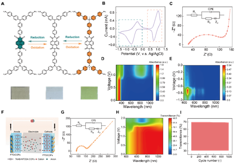 建筑和交通领域的绿色低碳转型是实现我国节能减排重大目标、落实国家“双碳”战略的核心所在。据统计,建筑能耗约占全球总能源40%,其中超30%用于保障稳定舒适的室内温度,而有效调节太阳光辐照,可减少照明、供暖和制冷负荷,使建筑平均节能约20%。通过外加电场实现可逆光学调控的电致变色(Electrochromic, EC)玻璃可以有效调节入射光的强度及其热增益,是一种极具前景的节能技术,已在建筑和交通领域实现应用。作为新兴的电致变色材料,共价有机框架(CovalentOrganic Frameworks, COFs)凭借其有序π共轭结构与可调孔道,为电子与离子协同传输提供了理想通道。然而,现有COF体系仍面临电荷迁移受限、离子扩散效率低及掺杂离子利用率不足等问题,亟需通过结构设计实现高效、稳定、多色可调的电致变色响应。