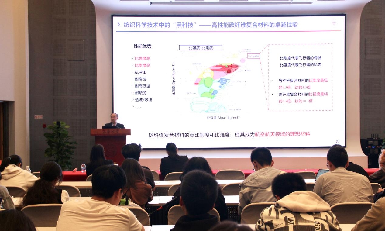 超高速飞行器使用碳纤维复合材料实现性能跃升,高速列车转向架依靠三维编织技术实现轻量化、高强度提升,神舟飞船用特种纺织材料适应太空极端环境……这些闪耀在国之重器上的“纺织身影”,正是纺织科技新质生产力的重要体现。近日,中国工程院院士、机械工程学院教授孙以泽登上《锦绣中国》讲台,以“纺织科学技术中的‘黑科技’”为题带来“强国版”第二讲,用一个个“硬核”案例带领师生走进纺织科技赋能强国建设的神奇世界。党委副书记、马克思主义学院院长王治东出席并主持活动。
