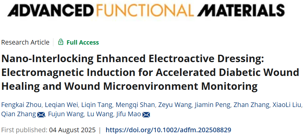 论文信息:F. Zhou, L. Wei, L. Tang, M. Shan, Z. Wang, J. Peng, Z. Zhang, X. Liu, Q. Zhang, F. Wang, L. Wang, J. Mao, Nano-Interlocking Enhanced Electroactive Dressing: Electromagnetic Induction for Accelerated Diabetic Wound Healing and Wound Microenvironment Monitoring. Adv. Funct. Mater. 2025, e08829.