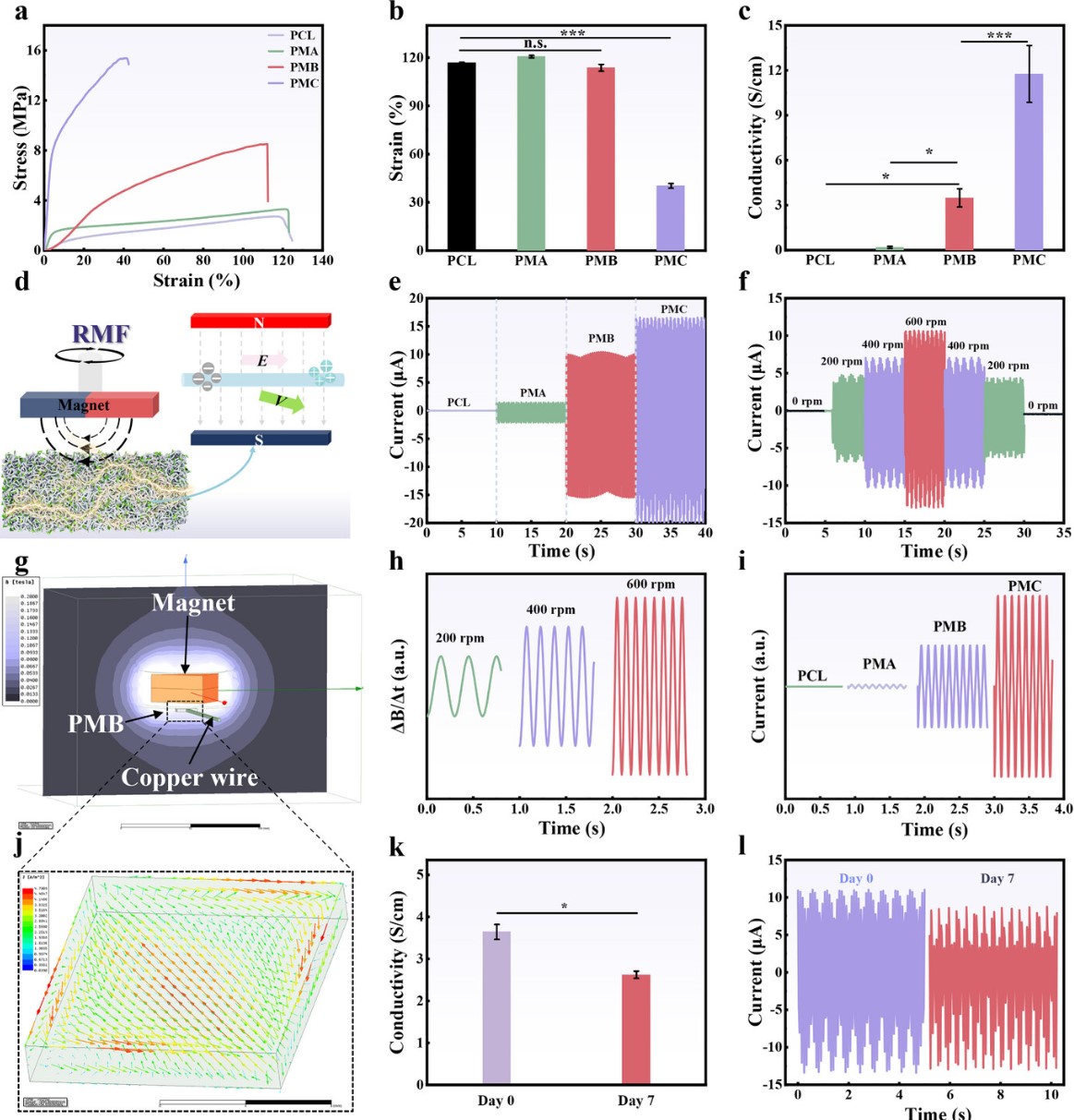 图3 电活性纤维膜的机械性能和无线微电流测试