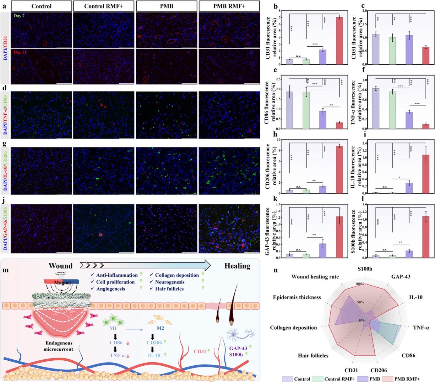 糖尿病患者的伤口因血管病变、神经损伤和慢性炎症形成恶劣微环境,导致愈合和功能重建面临巨大临床挑战。传统电刺激虽能促进细胞增殖迁移、减轻炎症、调节血液循环以加速愈合,但其存在刚性金属电极易引发炎症感染、外部电源设备庞大且需有线连接、操作复杂及成本高等问题,且患者因感觉神经受损难以感知伤口危险状态,增加了创面护理的难度和经济负担。