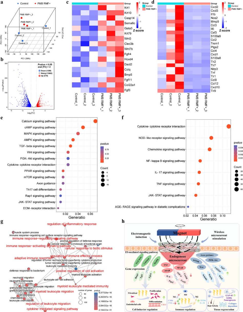 本研究成功开发了一种基于电磁感应的无线、自供电、电活性敷料,其有助于糖尿病伤口的快速愈合和功能性皮肤重建,并能够监测伤口微环境变化。Ti3C2Tx MXene与PCL纤维之间形成的纳米互锁结构使敷料具有优异的机械性能和导电性。体内/外研究表明,电活性纤维膜基于电磁感应原理产生的无线微电流有效调控了细胞行为(增殖、迁移和分化)。RNA测序结果证明多种信号通路如钙、TGF-β、PI3K-AKT、PPAR和Wnt被激活,并下调TNF、NF-kappa B和 IL-17 信号通路。这导致相关基因的表达发生变化和细胞因子的释放,从而减轻炎症反应,促进细胞外基质重塑、伤口愈合、神经和毛囊等皮肤附属物的再生。此外,利用电活性纤维膜对温度、应变和渗出液的电阻响应性,成功实现了对伤口微环境生理信号的监测,为智能医疗在提高伤口护理管理的精确性和效率方面的进步做出了重大贡献。该策略拥有便携、无创、无线的优势,并具有监测能力,凸显其在糖尿病患者伤口愈合中的巨大应用潜力。