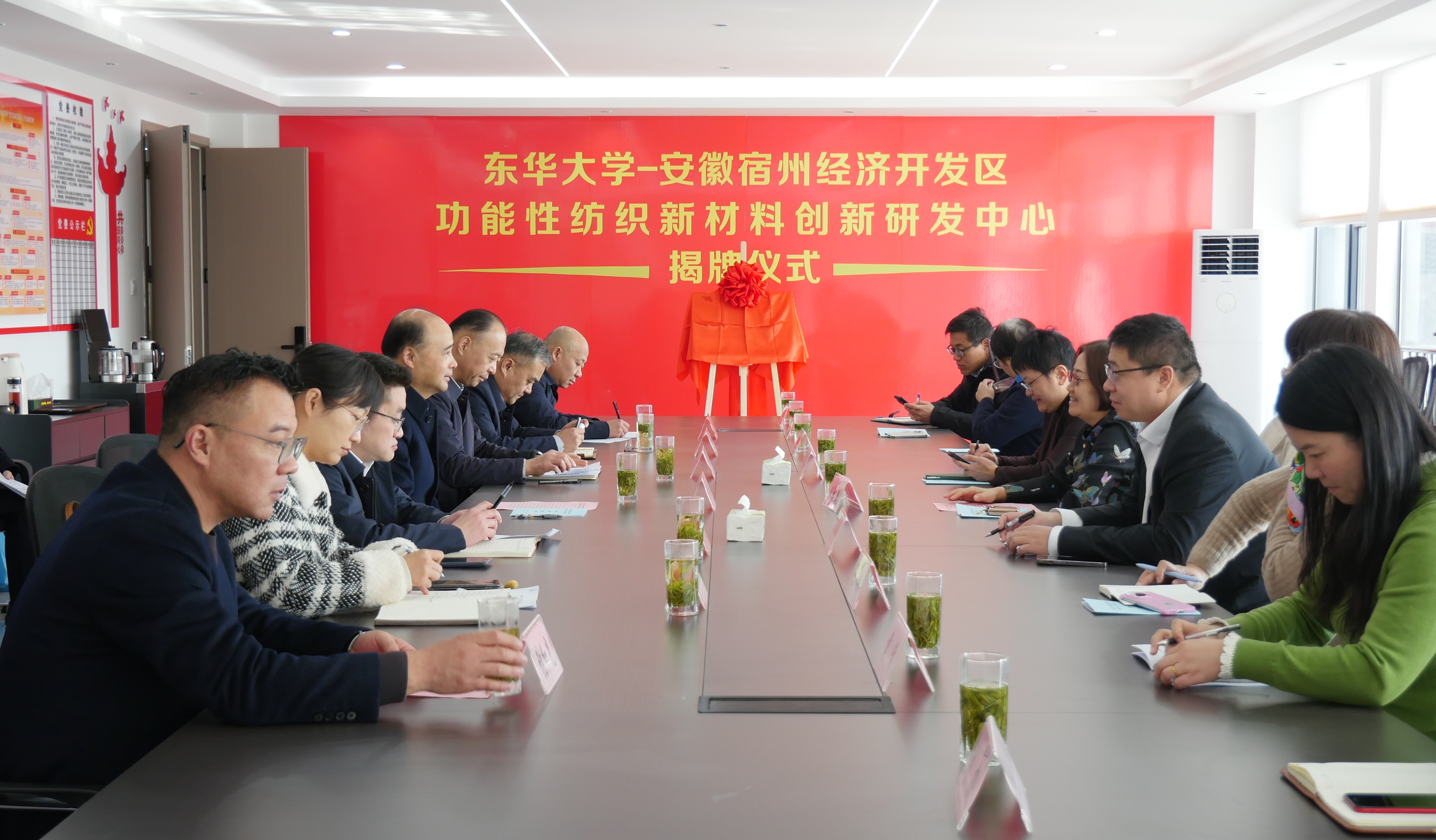 为全面深化校地战略合作,推动产学研协同创新与科技成果高效转化,12月3日,我校与安徽省宿州市经济开发区共建的“功能性纺织新材料创新研发中心”在安徽鑫圣佳无纺科技有限公司正式揭牌成立。揭牌仪式以“协同创新·共启未来”为主题,东华大学党委常委、副校长刘淑慧出席,科研院、纺织学院相关负责人及师生代表参加仪式。宿州市委常委、副市长祖钧公出席并致辞,揭牌仪式由宿州市经开区党工委委员、管委会副主任陈少兴主持。