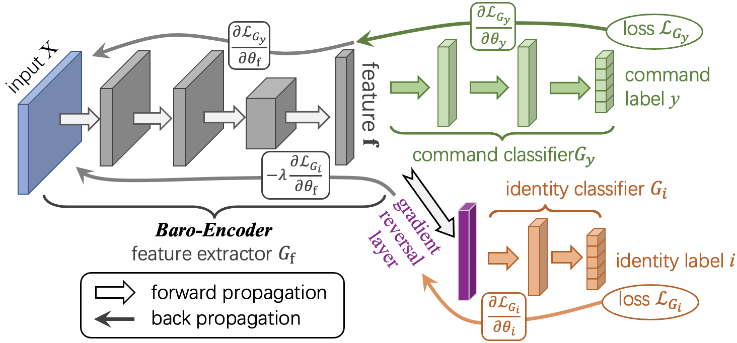 为此,本研究将微型气压计嵌入标准耳塞中以捕获TPVS,并利用其重建梅尔语谱图,而非直接还原文本内容。这是因为压力信号的采样率(约100 Hz)远低于音频信号,导致低频TPVS与高维文本嵌入之间存在显著的维度失配。直接将TPVS映射到文本将需要海量的数据。相比之下,梅尔语谱图将TPVS转化为符合语音特征的高频表示,在桥接模态差异的同时保留了共振峰和基频轮廓等关键特征。此外,由于梅尔语谱图是通用自然语音识别系统(如Whisper)的标准输入,所以成为了理想的中间表示。然而,本研究仍然面临三个关键挑战:1.低信噪比与易受干扰的压力信号。本研究提出一套数据预处理流程,包括直流漂移去除、带通滤波和信号放大,以降低噪声并清晰化形变信号。并通过局部稳定性检查增强的短时能量检测方法,从连续的TPVS中提取无声语音形变事件;2.用户间差异与节奏多样性。如图3所示,本研究使用领域对抗学习训练了一个Baro-Encoder,以提取用户不变的语义特征。同时,设计了一种基于节奏感知的数据增强策略,生成TPVS的时域扭曲变体,增强对说话速度变化的鲁棒性;3.非声学模态与缺乏细粒度监督。如图4所示,与基于声带或扬声器振动的语音信号不同,TPVS源于人类内部发音动作,不含声能。其频谱图在语音领域并非固有有意义,使得直接映射到音频频谱图变得不可行。此外,无声语音缺乏对齐的音素或帧级标签,阻碍了传统监督回归或基于对齐模型的使用。