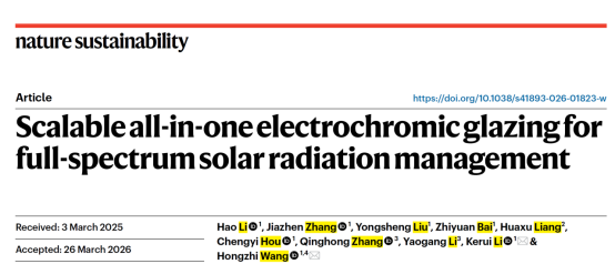 在当前全球能源转型与科技飞速发展的浪潮中,这些现象引发了社会对具有光-热管理功能的新型玻璃门窗的持续关注。智能电致变色调光玻璃具备高效光谱调控能力,能够在透明与着色状态间自主切换,有效阻隔可见光与近红外热量,已成为推动绿色建筑与低碳交通系统建设的重要方向,然而开发低成本、高稳定、大尺寸的太阳光全谱段电致变色玻璃依旧是整个领域的关键挑战。