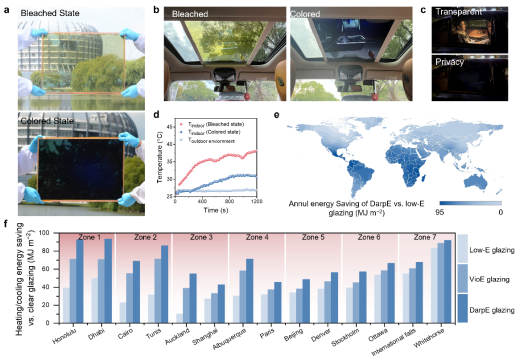 太阳光的能量主要集中在可见光与近红外波段。得益于DarpE器件卓越的宽光谱调控能力和稳定性,它能够阻隔太阳辐射,实现高效的“隔热”效果。作为理想的隔热屏障,DarpE器件可广泛应用于建筑智能窗和汽车调光天幕等领域,不仅能阻挡刺眼的阳光进入室内或车内,还能有效降低内部温度,提升人体舒适感。同时,该器件也有助于减少空调等制冷设备的能耗,推动建筑与汽车领域的节能减排,积极服务于国家“双碳”战略(图4)。