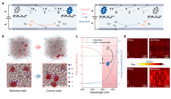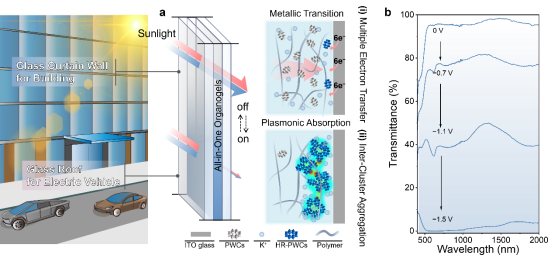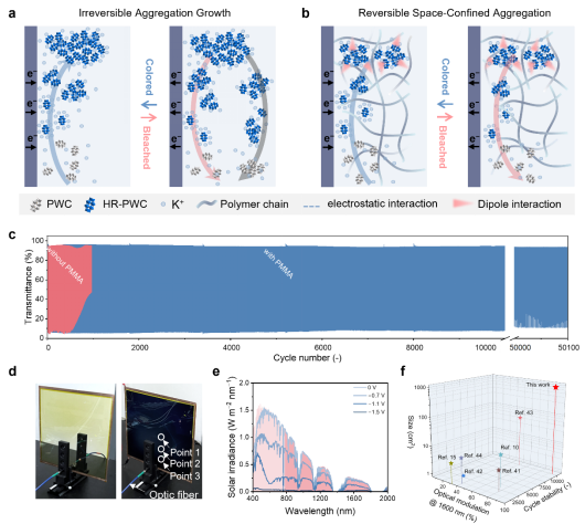 在施加电压后,多酸团簇会迁移到电极界面处,驱动更多电子注入多酸团簇,促使团簇的多电子转移,完成由绝缘态向半导体–金属态的转变。高还原态的团簇在电致变色杂化凝胶中会自发聚集,发生空间分布的动态重构,团簇聚集体之间的等离子体耦合增强近红外吸收,使器件具备优异太阳光谱调控能力(图2)。